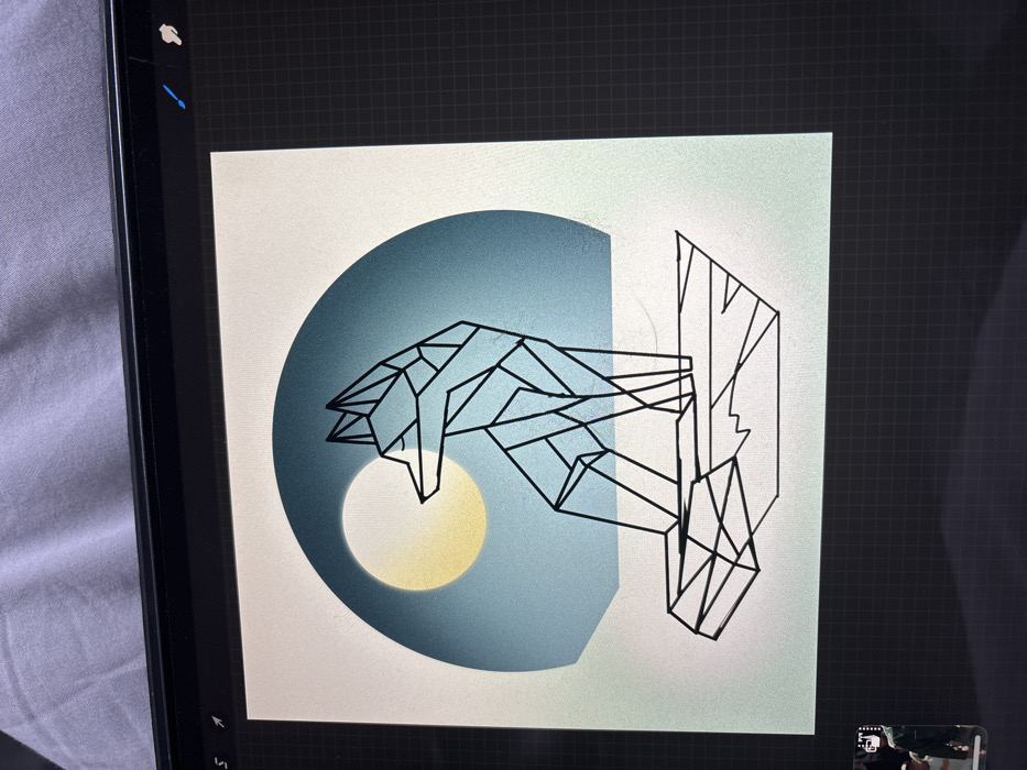 A digital drawing is displayed on a tablet screen, depicting a geometric-style fox figure
