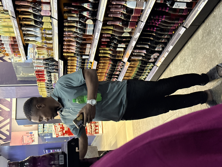 In an indoor shopping environment, a person stands near shelves stocked with various wine and champagne bottles. The individual is wearing a light-colored collared shirt, black pants, and dark shoes. They hold a smartphone in one hand and have a green sports drink under their arm. A shiny watch adorns their wrist. The shelves are densely packed with different alcoholic beverages, and part of a purple shopping cart is visible at the bottom of the frame.