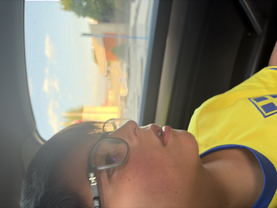 A person wearing glasses and a yellow t-shirt with the Swedish flag is reclining in a car. The person is seen in profile, with their head tilted back, looking out the car window. The car window shows a blurred view of buildings and sky outside. The car's interior is visible, with the person's face and part of their shoulder in focus. The image is slightly rotated.