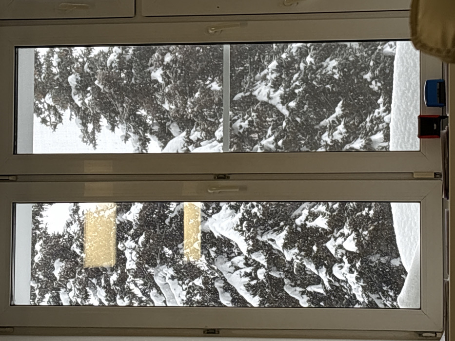 A white-framed window shows a snow-covered evergreen tree filling the entire view