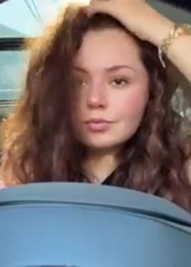 A young woman with curly brown hair is sitting in the driver's seat of a car, adjusting her hair. She's wearing a black top, and her fingernails are painted red. She then puts on a pair of sunglasses with a gold frame and appears to pose playfully for the camera. The car has a sunroof. The scene is bright, possibly daytime.