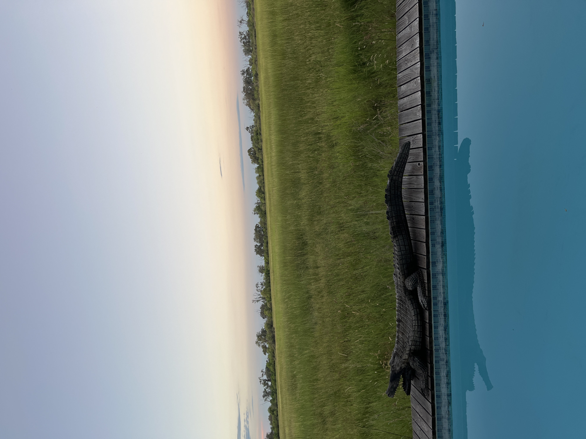 rural scene in Khwai, Botswana, near a man-made structure. In the foreground, a dark-colored, wooden-carved crocodile rests on a wooden deck adjacent to a blue swimming pool. The pool reflects the crocodile's shape. Beyond the deck and pool, there's a vast expanse of tall green grass and a line of trees, extending into a fading sunset horizon with colors of blue, orange, and yellow. The sky occupies a significant portion of the image, displaying a gradient of colors.