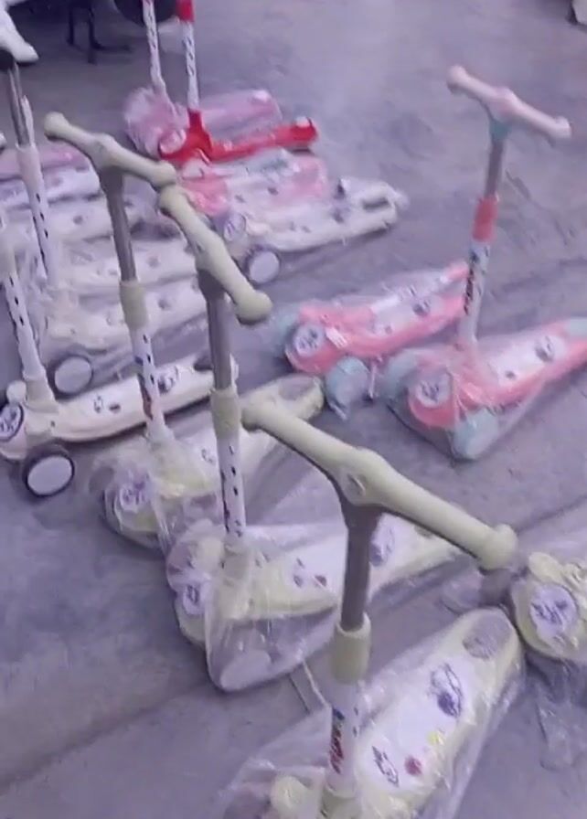 showroom-like space, possibly a store or warehouse, where several scooters are lined up on the floor. These scooters are mostly in pastel colors, with some being cream-colored and others in shades of pink and red. They are wrapped in clear plastic packaging. A few motorcycles are visible in the background, along with various packaged items stacked on shelves. A person wearing a white shirt and dark pants stands in the background, observing the scene. The floor appears to be concrete. The overall lighting is bright and commercial, suggesting a retail environment.