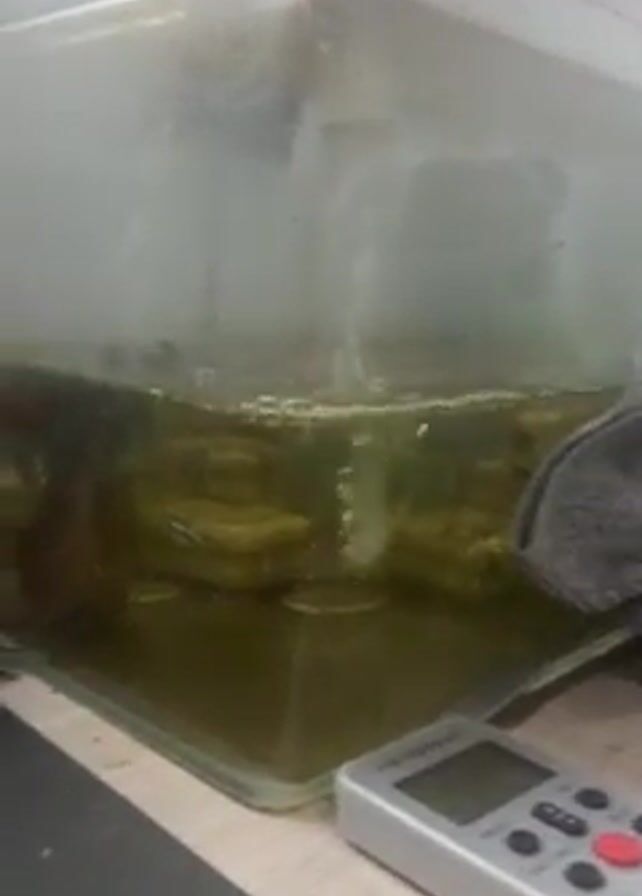 The video presents a medium shot of a square-shaped fish tank, three-quarters full with murky, green-tinted water