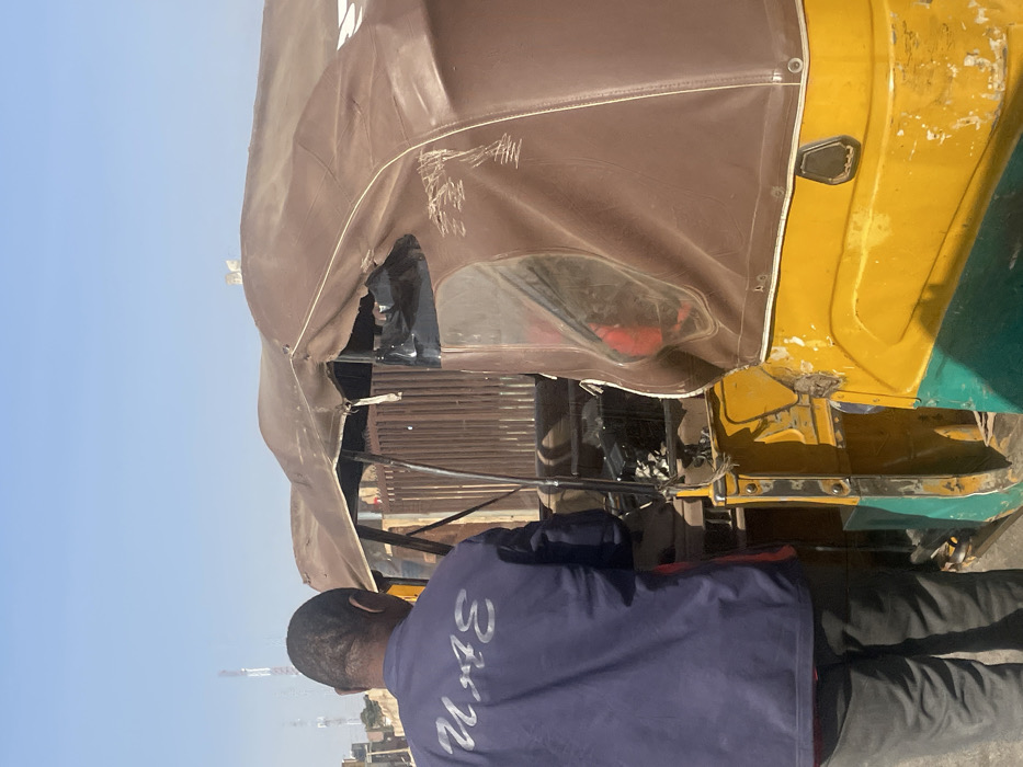 A male individual stands facing a yellow and green three-wheeled auto-rickshaw with a brown canvas roof in Kabong, Nigeria