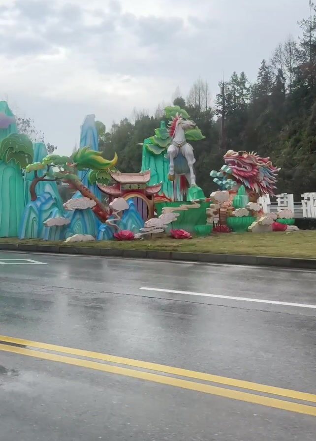n elaborate roadside display featuring a rearing white horse, a vibrant dragon, stylized trees, and buildings, all rendered in bright colors. The display is set on a grassy island within a wet road. The camera is positioned inside a moving vehicle, capturing the scene as it passes by on a rainy day. A silver and blue car drives past the display in the opposite direction. Further down the road, there's signage in Chinese characters and a street with a few visible vehicles, including a red bus. The overall setting is an urban area with trees and a mountain range in the background.