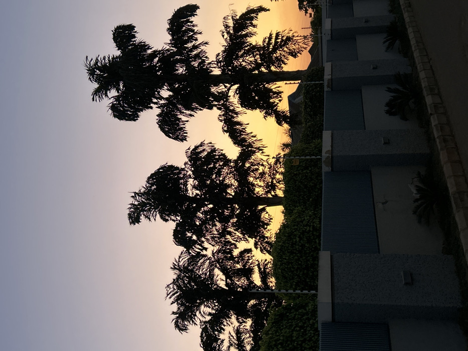 Palm trees stand in silhouette against a vibrant sunset sky. The sky transitions from a pale lilac to a warm golden hue, with the brightest light peeking through the branches. Adjacent to the trees are buildings with textured facades, separated by a hedge row. The buildings have muted blue and gray tones. The composition is shot from a low angle, with the scene rotated, presenting a unique perspective.