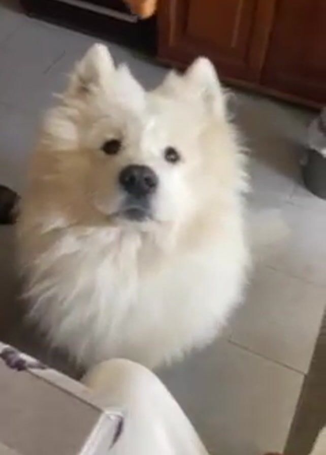 A fluffy, white Samoyed dog sits on a gray-tiled floor in what appears to be a kitchen