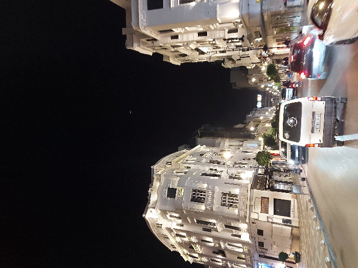 A nighttime street scene displays illuminated white buildings lining both sides of a road. Vehicles, including a white van with distinct markings, populate the street. Streetlights enhance visibility, highlighting architectural details. The sky above is dark, contrasting with the well-lit urban environment.