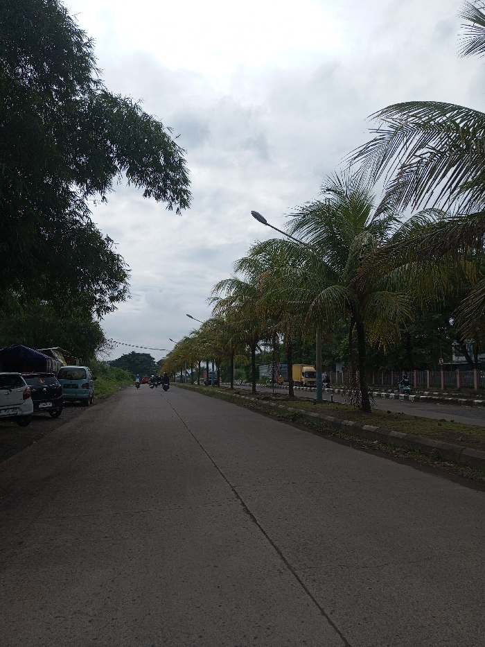 The scene depicts a straight, two-lane paved road under an overcast sky in Kodarapalli, India. The road is marked by a faded white center line. On the immediate left, a dense wall of dark green foliage, possibly trees and bushes, borders the road. Parked on the left shoulder, partially obscured by the foliage, are a white sedan, a dark sedan, and a light blue minivan. Behind these vehicles, a blue tarp structure is visible. Further down the left lane, a group of motorcycles and possibly other small vehicles are moving away from the viewer. On the right side of the road, a raised median strip separates the traffic flow, featuring a uniform line of multiple palm trees extending into the distance. Streetlights are mounted on poles interspersed among the palm trees. Beyond the median, a parallel lane of traffic is visible, with a yellow truck and other vehicles in the background. A fence or barrier is present along the far right edge of the image, separating the road area from distant structures and trees. No specific individuals or their actions are discernible in detail.