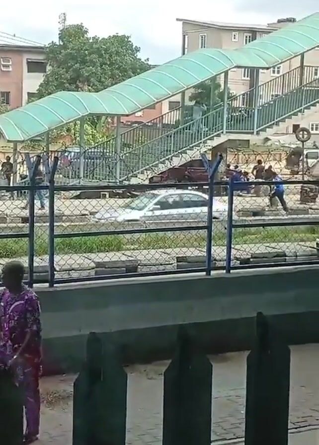 view of a pedestrian bridge over what appears to be a road or train track. The bridge has a green translucent roof and metal stairs. People can be seen walking on the bridge and around the base. Various vehicles, including an orange van, are parked nearby. In the foreground, a metal fence partially obscures the view.