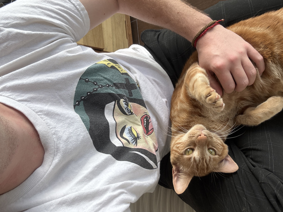 A ginger cat lies on a person's lap, paws curled, gazing upward. The person's hand rests on the cat's belly. The person wears a white t-shirt with a stylized illustration of a face, and dark pants with faint lines. The person has a bracelet made of string. A wooden surface appears in the background.