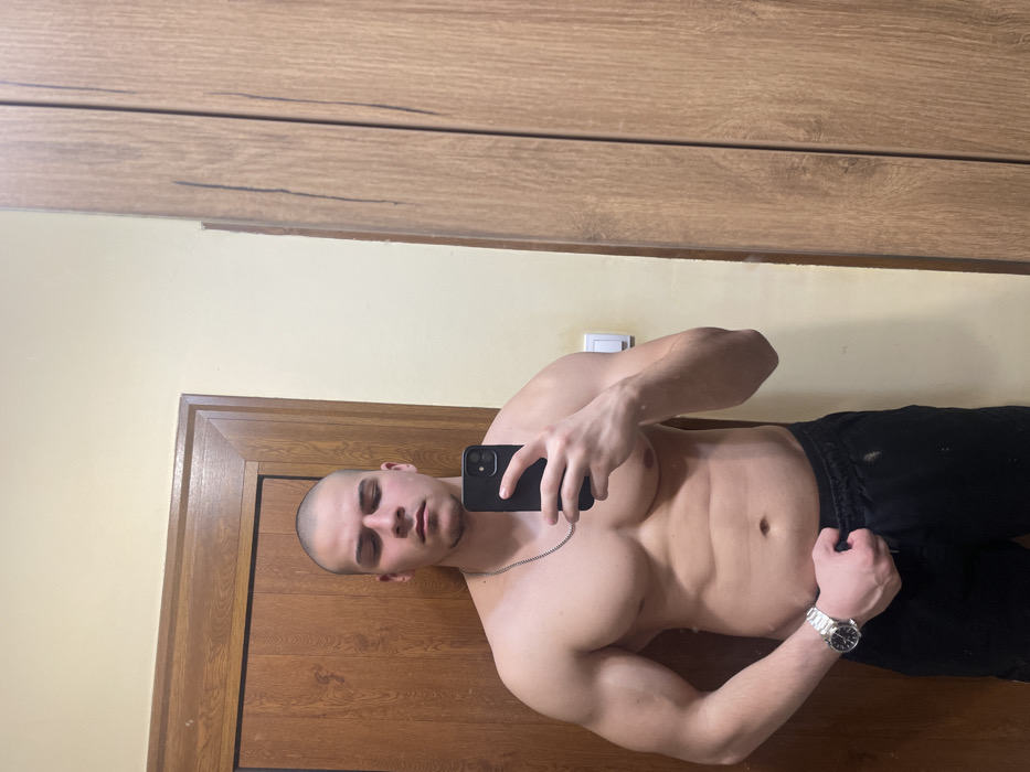 In an indoor setting within the city of Burgas, Bulgaria, a male individual is observed taking a mirror selfie. The subject, who has a shaved head and closed eyes, displays a muscular physique with a bare torso. He wears black athletic shorts, a silver-colored chain necklace, and a silver-colored watch on his left wrist. His right hand holds a black smartphone, pointed towards the reflection, while his left hand grips the waistband of his shorts. The background features a light-colored wall. To the left, a wooden door with a dark frame is visible. To the right, a multi-paneled wooden wardrobe or cabinet is present, alongside a white electrical outlet mounted on the wall.