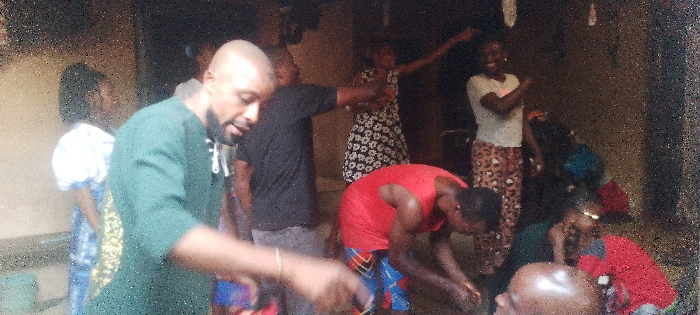 A group of people is gathered indoors, possibly for an event. A man in a green shirt is in the foreground. Behind him are several other individuals in casual clothing. One man is wearing a red tank top and colorful shorts, bending over. Two women in the background have their arms raised. The setting appears to be a modest home or community space, with simple architecture. The lighting is dim.