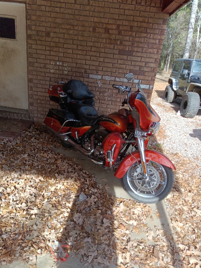 An orange and black motorcycle is parked on a concrete pad covered in brown leaves. The motorcycle is next to a brick wall, and a gray Jeep with large tires is visible in the background. The scene appears to be outdoors, possibly in a yard or driveway during the autumn season. The overall lighting suggests a sunny day.
