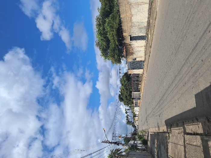 A bright blue sky with fluffy white clouds dominates the left side of the image. A weathered road occupies the right, bordered by a concrete wall interspersed with greenery. Telephone poles and wires stretch along the street. The image is vertically oriented, suggesting a perspective looking skyward along a street. Shadow falls across the pavement, indicating a source of sunlight outside the frame.
