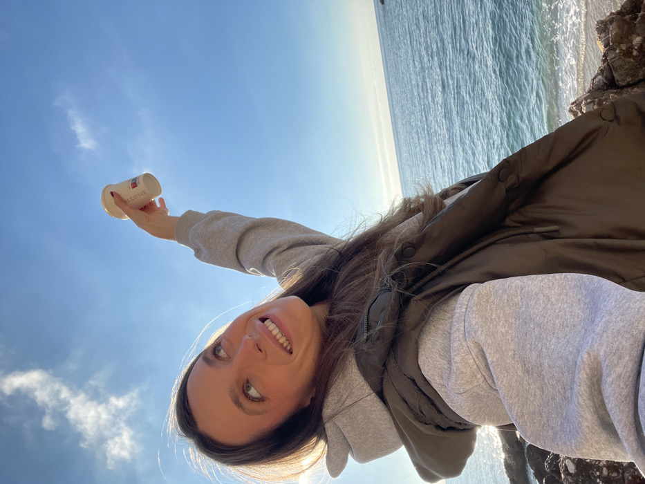 A female individual stands on a rocky shoreline in Drobnići, Montenegro. She has long brown hair and is wearing a light grey hooded sweatshirt under a dark olive green puffer vest. Her right arm is extended upwards, holding a white disposable cup with "COFFEE" and red and green branding visible. She is smiling, looking upwards and to the left, with her face partially backlit by sunlight, creating a glow around her hair. The environment consists of reddish-brown rocks in the immediate foreground, transitioning to calm, blue-green seawater with slight ripples extending to the horizon. The sky above is clear blue with a few wispy white clouds. A faint landmass is visible on the distant horizon to the right.