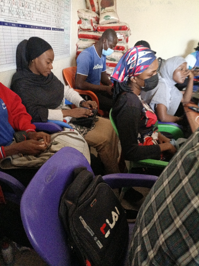 The scene takes place indoors in Fagge A, Nigeria, featuring multiple individuals seated. In the foreground, a purple plastic chair holds a black backpack with white 'FILA' branding. To the left, a person in a red and blue top is partially visible. Centrally, a dark-skinned woman in a black hijab and white long-sleeved top operates a small black electronic device. Beside her, a dark-skinned man in a blue 'Hollister' t-shirt and light blue medical face mask sits on an orange chair, focused downwards. To his right, a dark-skinned woman wears a patterned headwrap, a black medical face mask, and a black top with red and white patterns, looking right. A woman in a light grey hijab is partially visible further right, also oriented rightward. The background wall on the left displays a grid-patterned chart. On the right, a tall stack of white sacks, consistent with bulk goods, is present. Various plastic chairs in purple, orange, and green are used for seating. Individuals appear engaged in individual tasks or observing a shared focal point.