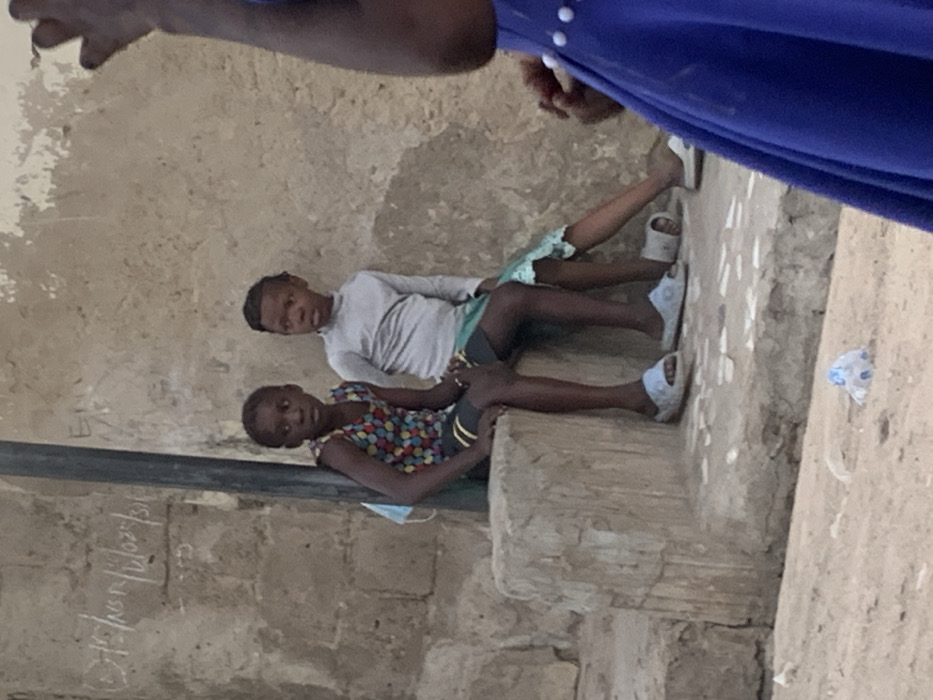 Two young individuals are seated on a raised concrete platform against a light-colored, weathered wall in Gwagwarwa, Nigeria