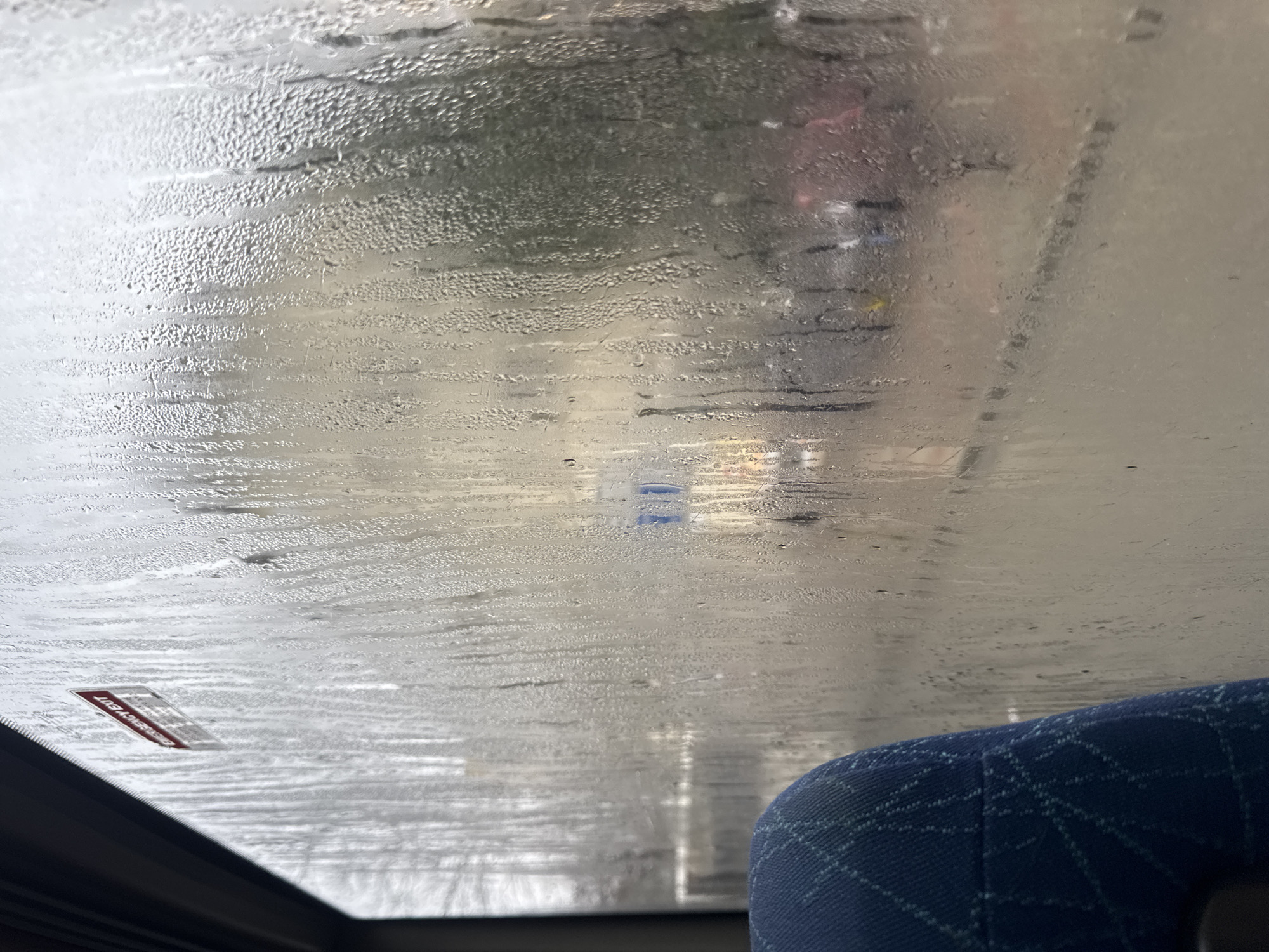 interior of a vehicle, possibly a bus, with a condensation-covered window providing a distorted view of the outside