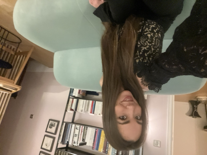 A woman with long brown hair and a black lace top sits on a light blue couch