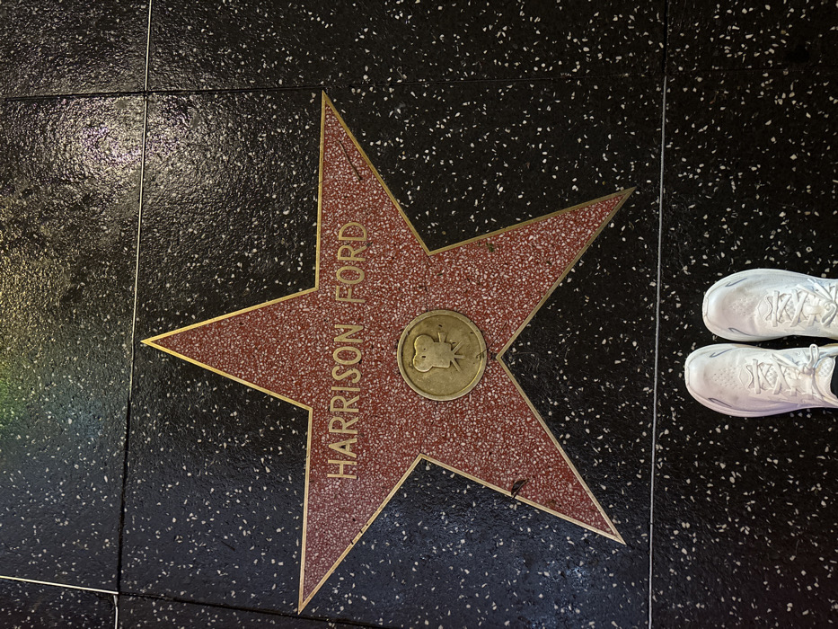 A ground-level shot showcases Harrison Ford's Hollywood Walk of Fame star