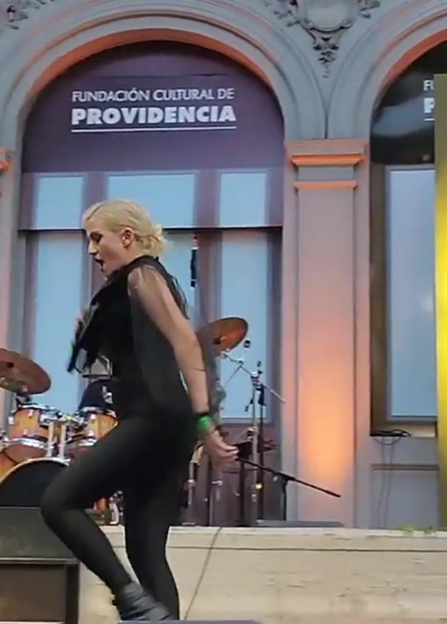 A woman with blonde hair is performing on an outdoor stage, singing into a microphone. She is wearing a black outfit consisting of a top with a sheer ruffled collar and sleeves, a belt, and tight pants, paired with black boots. She's energetic, moving and gesturing with her arms while holding the microphone. Behind her, a band is playing musical instruments. A drummer is on the left, visible behind the woman, and a guitarist in a black shirt and tie is on the right. The backdrop includes an ornate archway and signage with text. Lighting with yellow beams shines from behind the stage.