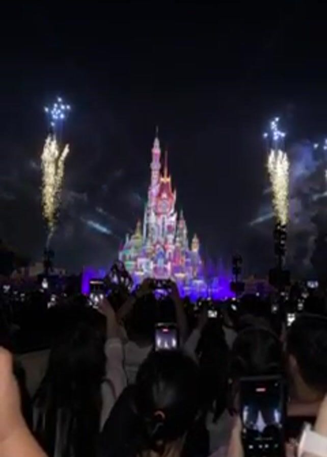 A video filmed at night shows a crowd of people holding up their phones to record a fireworks and light show in front of a large castle