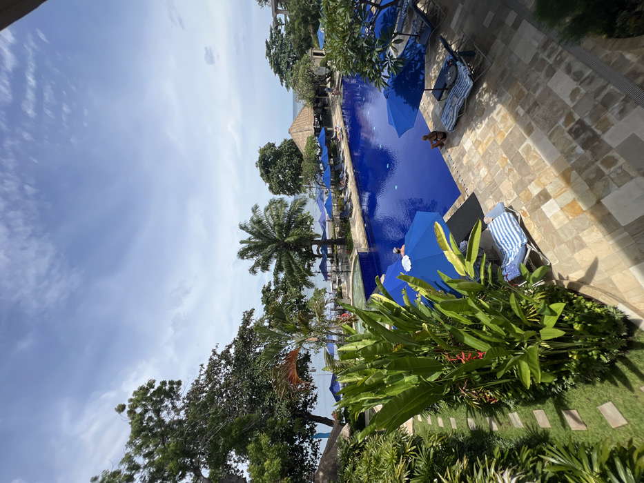 A bright blue swimming pool is lined with blue umbrellas and lounge chairs. Green vegetation is in the foreground, with a palm tree and other trees visible beyond the pool. The sky is blue with some clouds. The pool area is paved with light-colored stone tiles. A person is sitting on the edge of the pool.