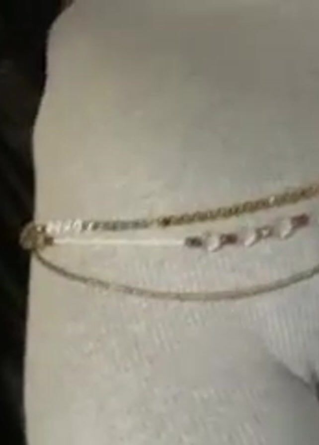 A close-up shot shows a person wearing grey ribbed leggings and a multi-strand beaded waist chain