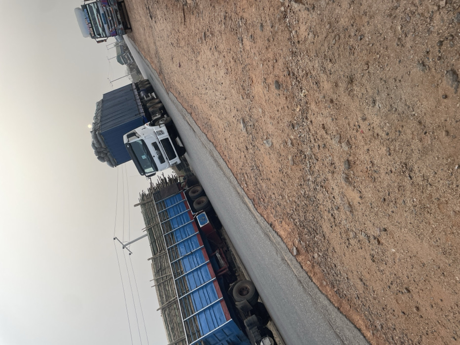 A landscape view of multiple cargo trucks lining a grey asphalt road with an extensive dirt shoulder. The first truck is laden with wood, its flatbed a vibrant blue and red. The second truck is carrying a large container, its exterior a dark blue. A white tractor pulls the container. The third truck has several rows of rectangular windows. The sky is obscured by a heavy haze, adding to the scene's muted colors.