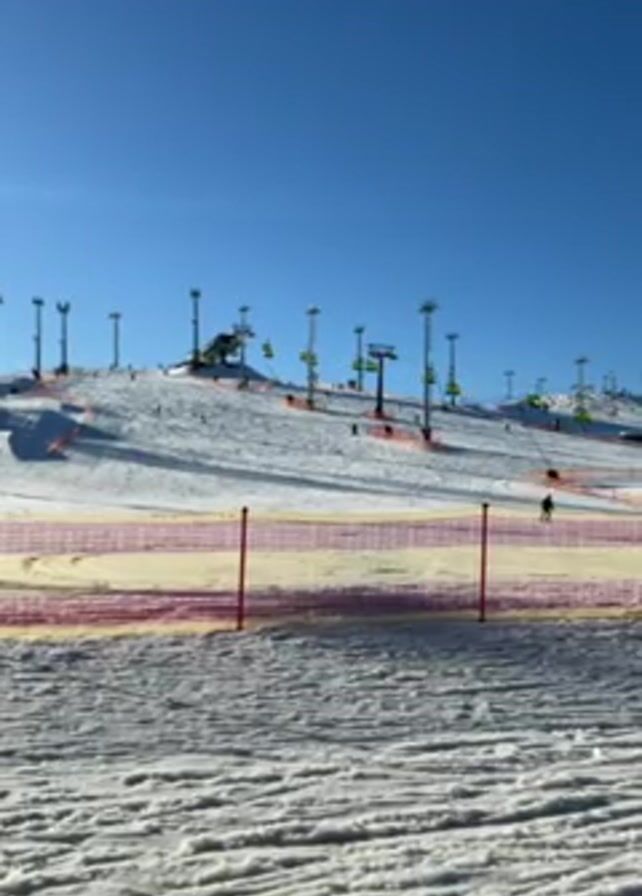ski slope on a clear, sunny day. The sky is a bright, solid blue. The ground is covered in snow, with visible tracks from skiers or snowboarders. A yellow and red safety fence runs across the lower part of the frame. Further up the slope, there are several ski lifts with chairs visible, and tall light poles scattered across the hillside. A few people can be seen skiing or snowboarding down the slope, appearing as small figures in the distance.