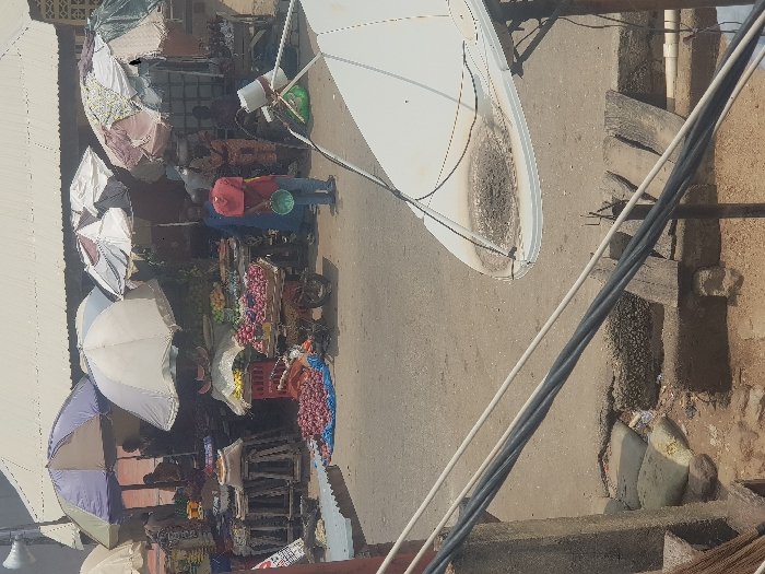 The image captures an active outdoor market scene under direct sunlight. In the mid-ground, multiple market stalls are arranged, displaying various fresh produce. Several large market umbrellas, including a striped purple and white, a plain white, and a patterned green umbrella, provide shade over these stalls. Piles of red spherical fruits or vegetables are visible, some placed directly on the ground, others loaded onto a two-wheeled pushcart. Additional produce, such as watermelons and other fruits, is displayed on tables. A building with a corrugated metal roof is partially discernible behind the stalls. Several individuals are present, engaging in market activities. A person wearing a red shirt and blue jeans stands with their back to the viewer in the mid-ground, holding a green bowl. Other figures are partially obscured by the market setup. The foreground features infrastructure elements: a concrete pillar on the left with multiple black and white electrical cables crisscrossing horizontally. A white satellite dish, exhibiting dirt and weathering, occupies the lower right foreground. The ground in the foreground is unpaved, uneven, and consists of dirt, exposed aggregate, and debris, including sandbags and wooden planks. Regarding the specified location, the visual characteristics of the market's infrastructure, ground conditions, and the methods of displaying goods are not consistent with typical urban market environments found in Atlanta, United States. These elements suggest an alternative geographical context.