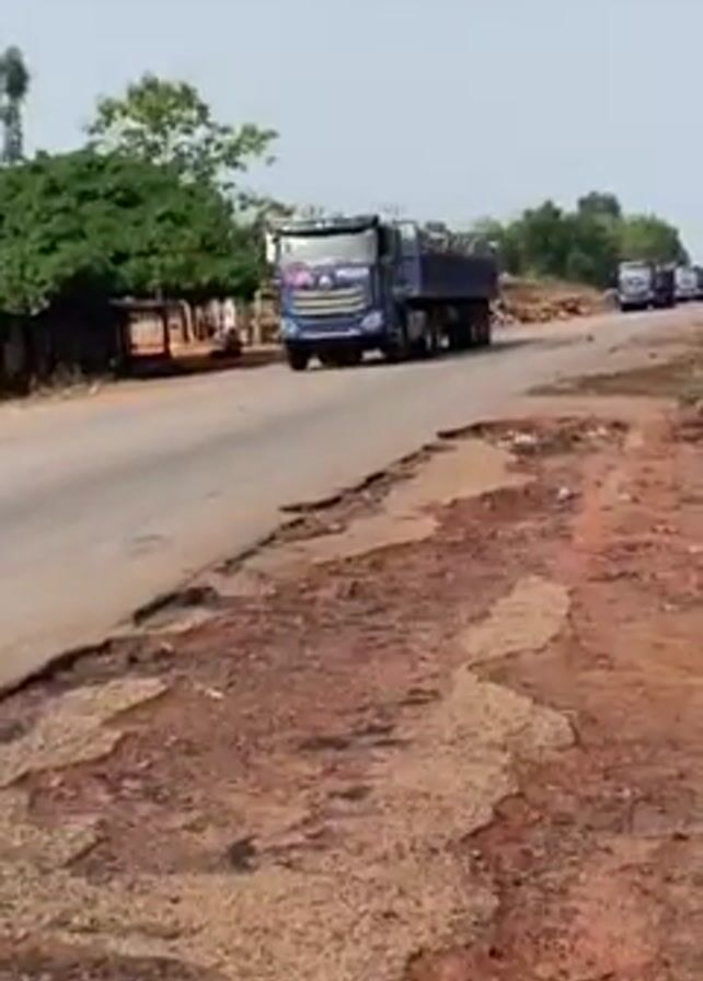 rural scene with a damaged asphalt road. Several blue dump trucks drive by, followed by others in the distance. There are scattered buildings, trees, and a motorcycle in the background. The environment seems dry with brownish soil along the road edges. The sky is overcast.