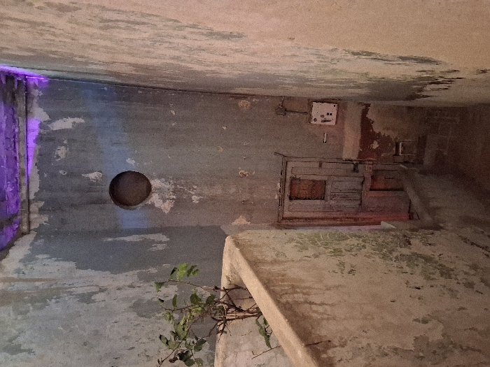 - "A dilapidated concrete room features peeling paint and a circular hole in the left wall, illuminated by purple light" by FM-27gwq2, licensed under CC BY 4.0