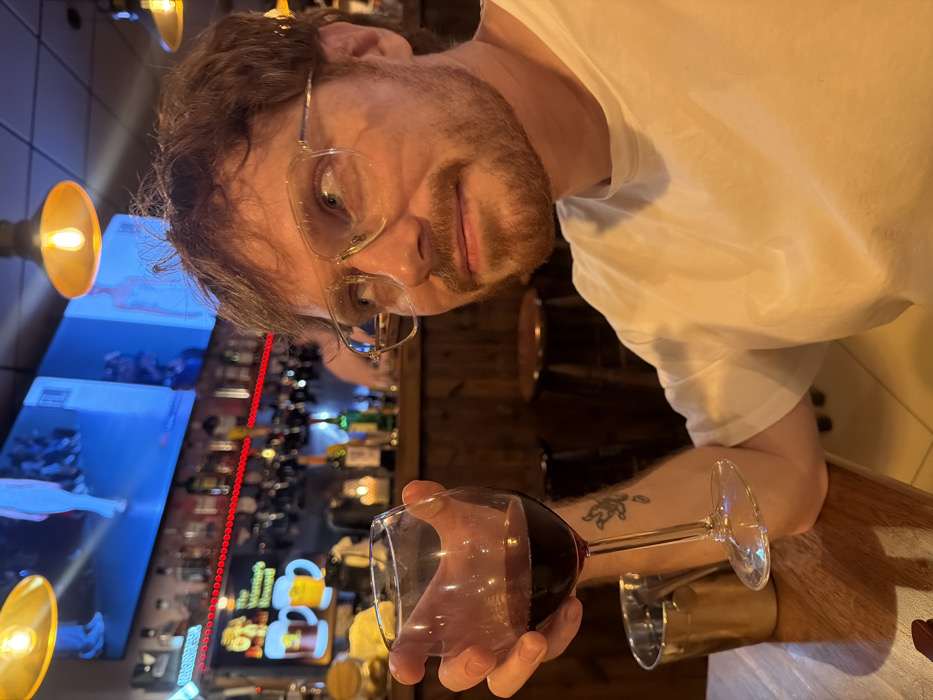 - "A man with glasses and a beard tilts his head downward toward the camera while holding a wine glass filled with red wine" by FM-k41Xm2, licensed under CC BY 4.0