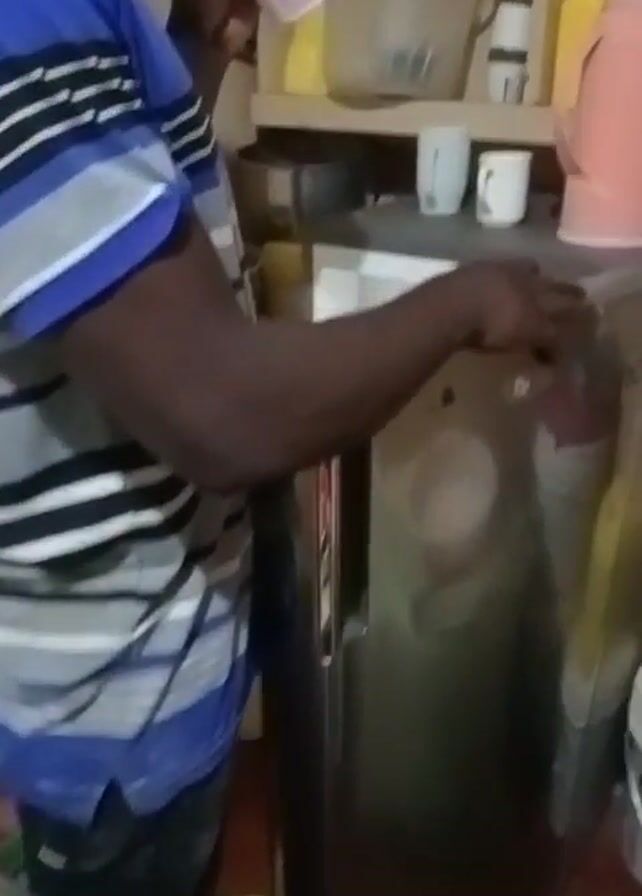 A person standing in a kitchen is drinking from a red-and-white cup. They are standing in front of a silver refrigerator. They are wearing a striped shirt with blue and gray colors. The kitchen has a wooden shelf above the refrigerator with various mugs and containers. The video is shot indoors.