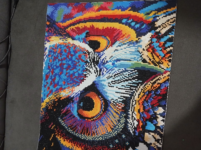 - "A completed diamond painting depicting a stylized, vibrant owl's head is shown laid flat on a dark grey, possibly fabric-covered surface" by FM-0UC0T2, licensed under CC BY 4.0