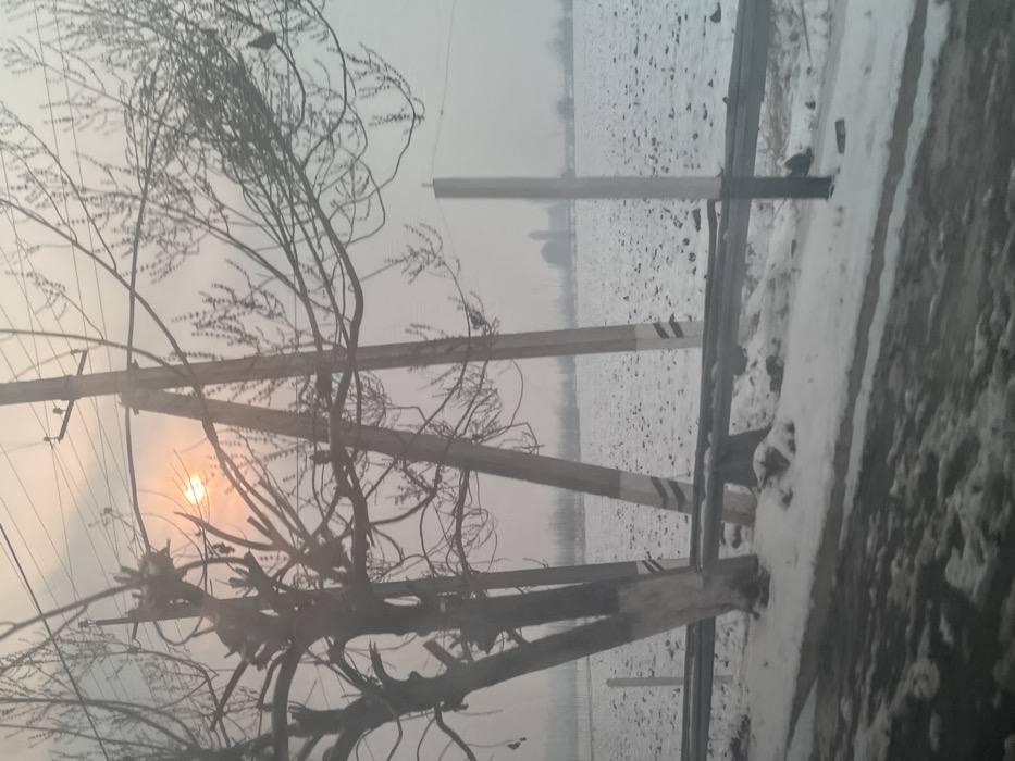 The image depicts a winter landscape in Andijan, Uzbekistan, under hazy or foggy conditions. In the foreground, a dark, likely wet road surface with patches of snow is visible. Immediately adjacent to the road, a snow-covered metal guardrail runs horizontally. Behind the guardrail stands a large deciduous tree with bare, heavily pruned branches, its lower trunk painted white. To the right of the tree, two concrete utility poles with black and white striped markings on their bases rise, supporting overhead wires that extend across the upper frame. The sun, a distinct orange orb, is partially visible through the thick atmospheric haze in the upper left quadrant, behind the tree's branches. The midground features a flat, open field covered unevenly in a thin layer of snow, revealing patches of dark soil. A slender, white vertical post is situated in this field to the right. In the distant background, obscured by the significant haze, faint silhouettes of bare trees and a large building with a dome and a vertical tower or minaret are visible on the horizon. The overall scene conveys a cold, muted environment with limited visibility.