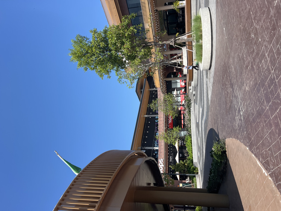 A vibrant outdoor scene features a modern shopping complex under a clear blue sky. The building showcases a multi-level structure with storefronts including "Tops." Lush trees punctuate the scene, adding a touch of nature. Intricate pavement designs lead to a pedestrian area. A decorative, curved structure with a green flag stands prominently in the foreground.