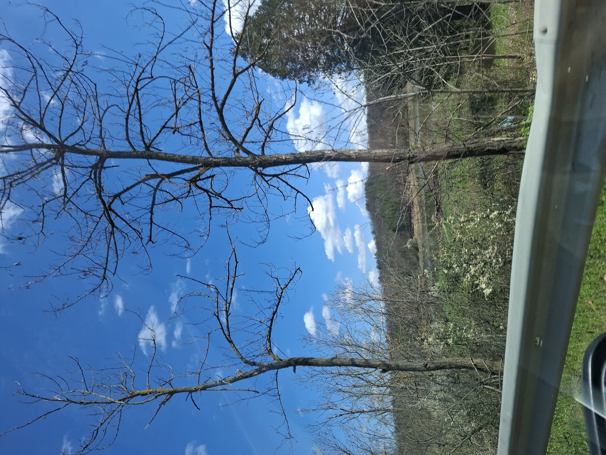 roadside view, likely taken from inside a vehicle, as indicated by the presence of a guardrail and the vehicle's interior visible on the right side of the frame. The landscape consists of trees with bare branches against a bright blue sky dotted with small white clouds. The terrain appears to be a valley or roadside area with green vegetation and possible flowering bushes. The location is unknown, and cannot be deduced as being in Blagovo, Bulgaria from this image.