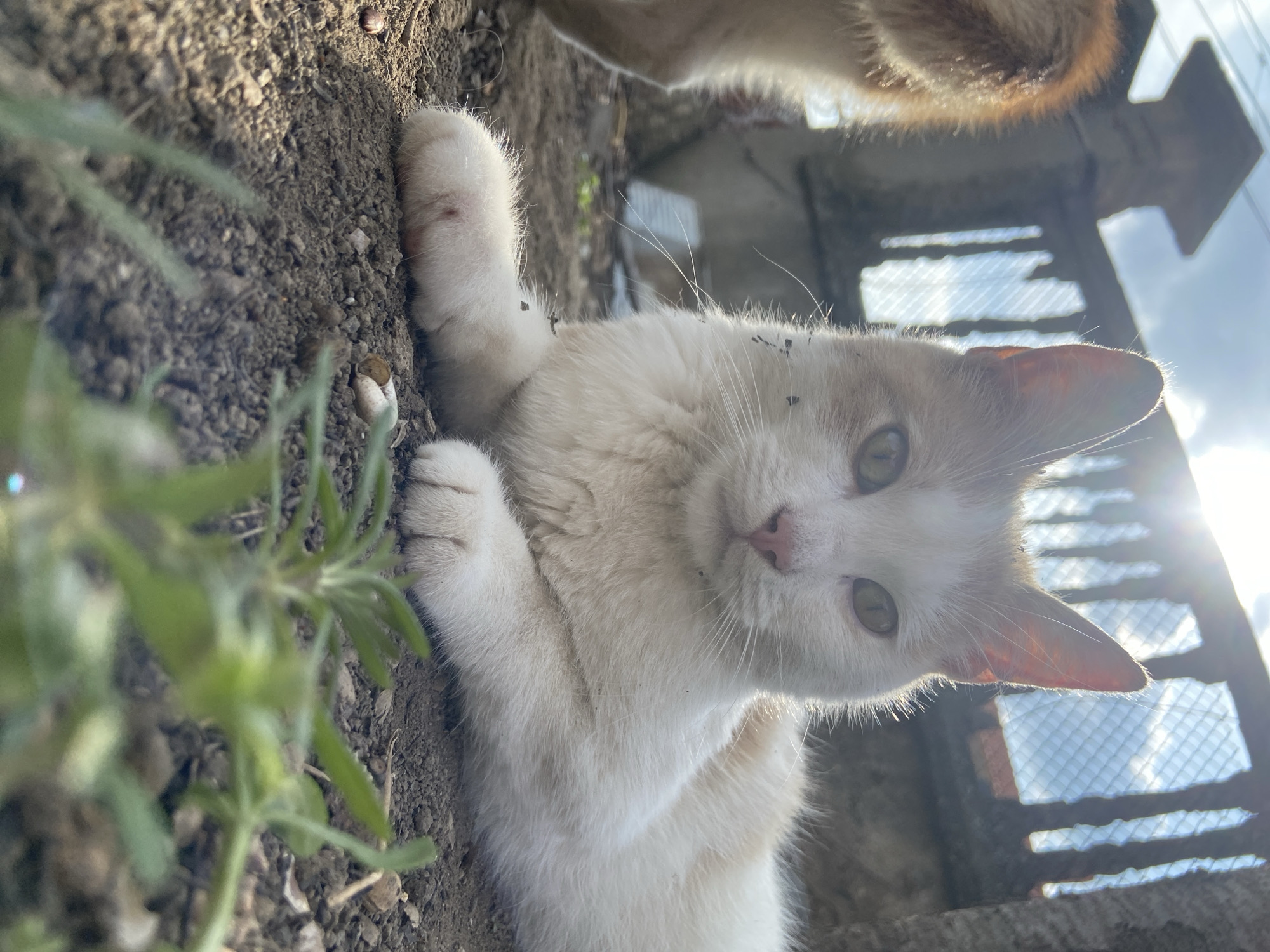 - "An outdoor, low-angle photograph captured in Gulyantsi, Bulgaria, shows a white cat with light ginger markings lying on dry, dark brown earth" by FM-JPbCw2, licensed under CC BY 4.0