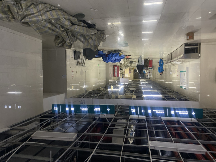 hallway in an indoor space, likely a public building in Qingdao, China, located at coordinates 35.987 latitude, 120.152 longitude. The hallway is undergoing renovations, evidenced by exposed ceiling grids, scattered construction debris, and a noticeable lack of furnishings. The floor is tiled and mostly empty, with some blue tarps and other construction debris lying on the floor. Three figures walk through the hallway, two appear to be construction workers, one is wearing a blue jumpsuit, the other a yellow vest, and the third is a man in a light blue shirt and dark pants. There are several signs in Chinese hanging above the hallway entrance. The signs appear to indicate directions to various levels or areas within the building. The overall impression is of a space undergoing significant renovation.