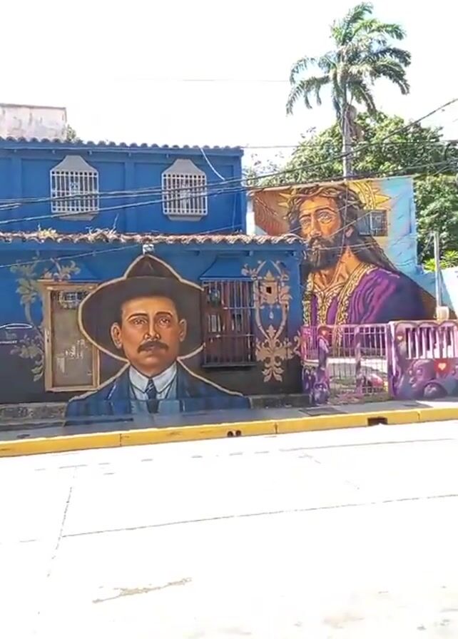 street in a sunny area with colorful buildings, street art, and trees. The camera pans from a mural of a man in a hat and a mural of a man in purple robes, to a drink stand with an umbrella and an orange traffic cone. Then the camera pans further to show the street with parked cars, traffic cones, and more colorful buildings with murals. There are power lines above the street. The sky is blue with some white clouds.
