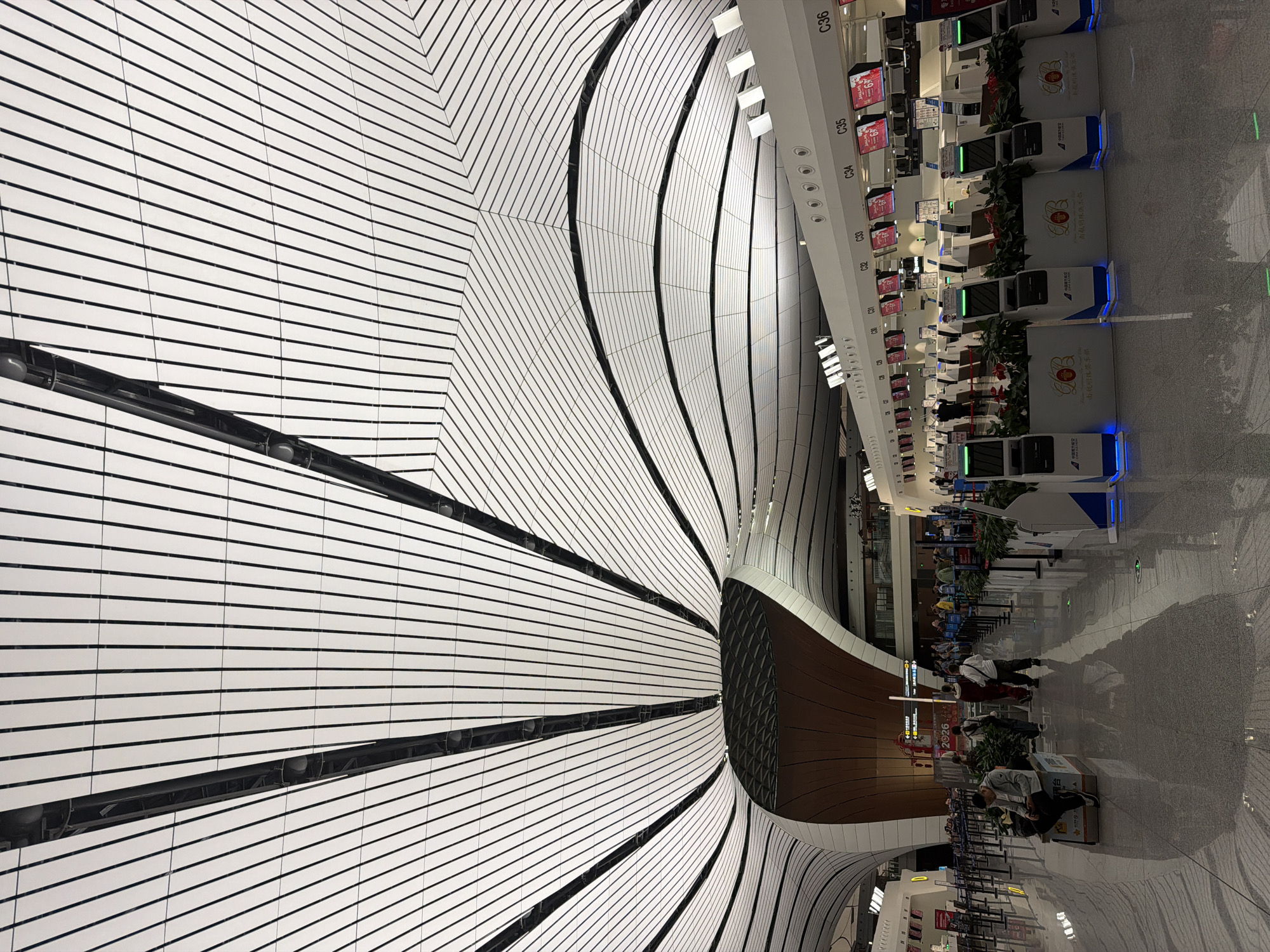 The image depicts the interior of Beijing Daxing International Airport, located in Langfang, China