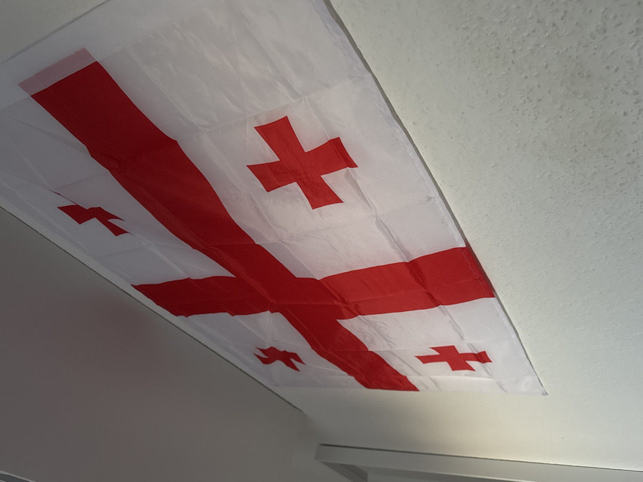 An indoor scene in Bischheim, France, depicts a rectangular flag, identified as the national flag of Georgia, affixed to a light-colored wall