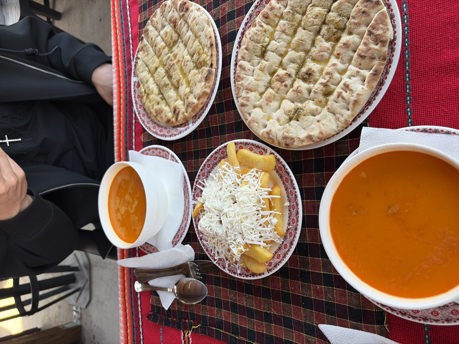 A table is set for a meal in Rumyantsevo, Bulgaria. A person is seated at the table, visible from the chest down, wearing a black jacket over a black garment with a silver cross pendant. Their hands are holding a mobile phone. The table is covered with a checkered tablecloth in red, brown, black, and beige, with a horizontal red and white striped fabric border at the top and a solid red section at the bottom right. On the table, there are two white bowls containing an orange-red soup, each resting on a white saucer with a red patterned rim and a white napkin. Adjacent to the upper soup bowl, a silver spoon and fork with dark handles are placed. One plate holds a portion of golden-brown french fries heavily topped with shredded white cheese. Two round flatbreads, marked with grill lines or indentations and drizzled with a light green oily substance, are presented on plates with red patterned rims. The background is out of focus, showing indistinct elements consistent with a dining environment.