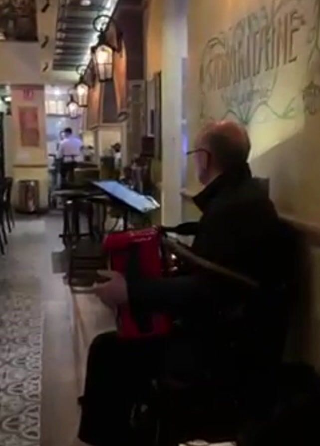 man sitting in a restaurant and playing a red and black accordion. The man is older, bald on top, wearing glasses, and dressed in black. He is seated with his back to the camera and is facing a music stand with a tablet or electronic device on it. The restaurant's interior features warm lighting from wall-mounted lanterns and a decorative wall with painted text. In the background, there are glimpses of a kitchen area with staff, and a dining space with tables and chairs. The floor has a patterned tile design.