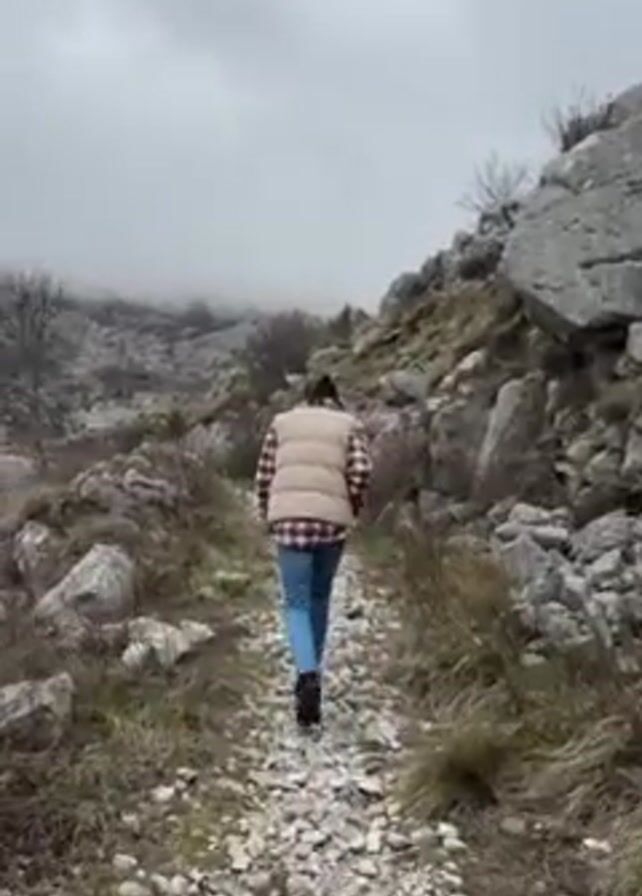 A woman is walking away from the camera on a rocky trail in a mountainous area