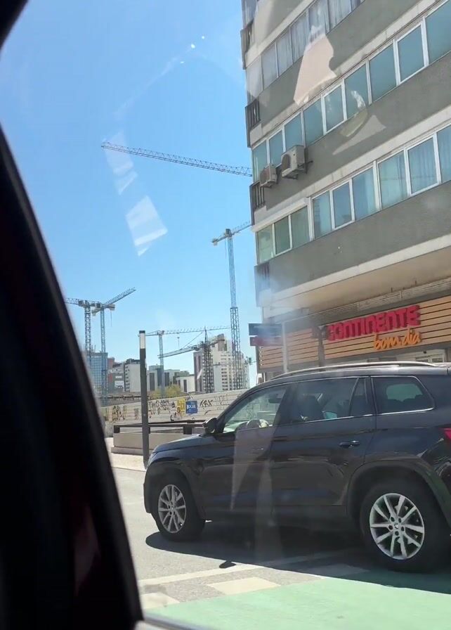 The camera, positioned in the back seat of a car, looks out the window at an urban street. A dark grey car is stopped at a crosswalk in front of a tall building, which has many windows. Three construction cranes are visible in the distance. The camera moves to the right to show the back seat, headrest and safety strap. The view moves to the front seat, with the driver’s grey head visible above the driver’s seat. The driver is wearing a dark blue shirt and sunglasses and holding the steering wheel.